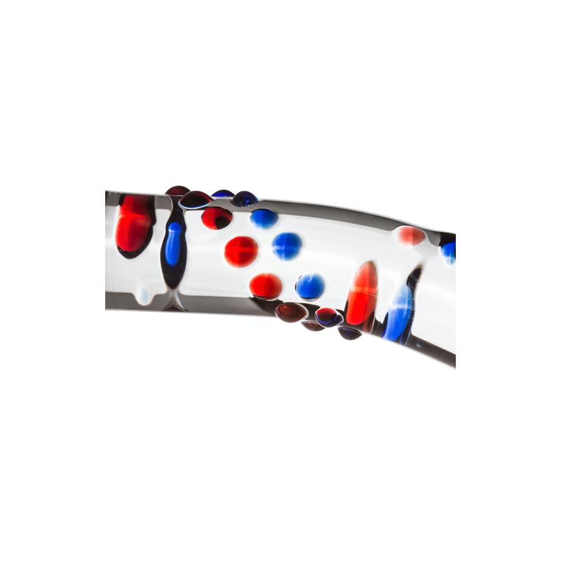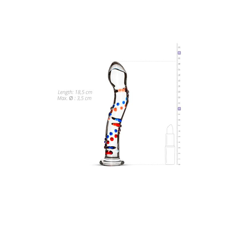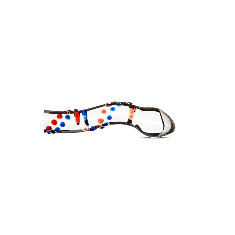 Este dildo es único, no pasará desapercibido entre tus sábanas. Fabricado de cristal transparente cuenta además con unos adornos en diferentes colores que, además, añaden una estimulación extra. Su forma curvada es perfecta para la estimulación del punto G y de próstata. Sus materiales no porosos te permiten combinar este dildo con tu lubricante favorito. Es muy fácil de limpiar con un limpiador de juguetes y un poco de agua tibia. ¿Quieres probar el juego de las temperaturas? Utiliza un poco de agua tibia o fría para que el dildo coja la temperatura que deseas (no meter en microondas o congelador)